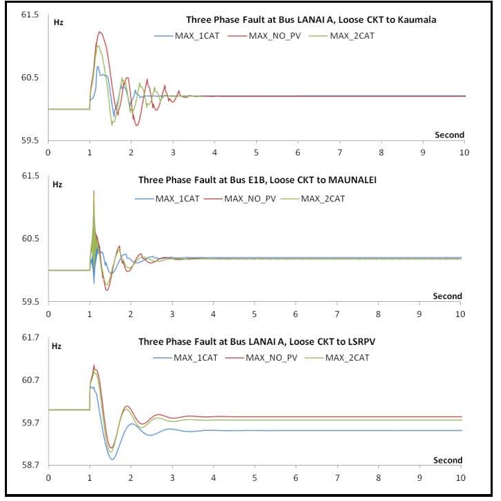 The frequency response comparisons for the different faults and generation dispatches at the day peak condition are shown in Figure 1. Although, there are some frequency fluctuations, these are within acceptable ranges. The system voltages (not shown) were likewise within acceptable ranges. Hence, the system can operate stably with the PV in service.