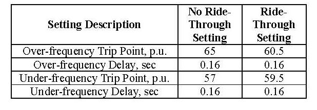 Several operating scenarios were developed with various combinations of the diesel generator and PV units in service, and with and without the battery. The battery is set to Low Frequency Control (“LFC”) mode. Some of the PVs are modeled with frequency ride-through capability, but not all. The frequency settings are summarized in Table 1.