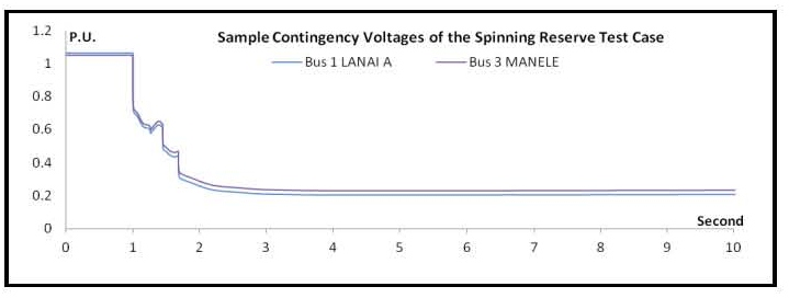 After simulating various scenarios, it was determined that at least three diesel units need to be in service. (The battery is in excursion control mode). With only two units, the voltage collapses on loss of one of the units. The voltage response is shown in Figure 2.