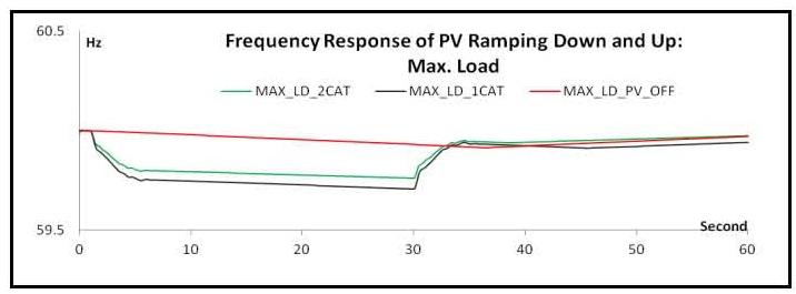 Additionally, the potential impact on system operation caused by solar radiation shifting from maximum to minimum was assessed. This phenomena is associated with cloud cover going across the field of solar arrays, first covering then uncovering the arrays. A ramp rate of 60kW/sec for each PV plant was used. The resulting frequency excursion during day peak conditions is shown in Figure 3.