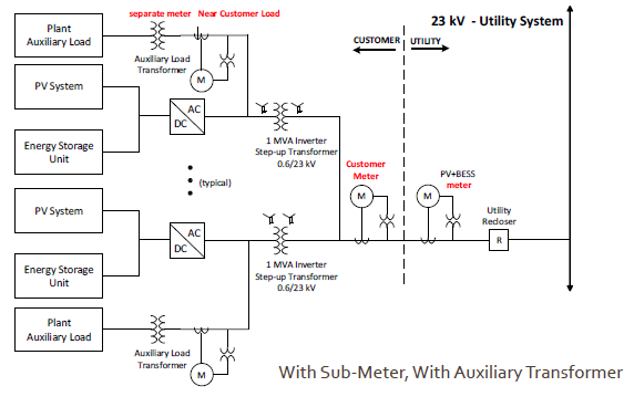 The net energy for hybrid systems can vary over the course of a day — at times delivering and other times withdrawing power from the grid. A meter, known as the main or primary meter, located at the interface between the facility and utility (the point of common coupling or PCC) measures the net energy of the facility. This meter uses an instrument transformer (IT) that has a specific error range for loadings from 10% up to multiples of 100% of the IT rating. Below 10% loading, the measurement error increases. However, at those times that the PV+BESS is charging from the grid, its load can typically be below 10% of the IT rating. Utilities point out that this higher measurement error requires that a second meter be installed rated for the auxiliary loads of the facility. The second meter is sometimes referred to as the auxiliary or sub meter. Since the auxiliary meter measures the load of the facility, it is located within the facility and far from the PCC, requiring additional, costly fiber cabling. How much more accurate will the net energy metering be with a second meter?